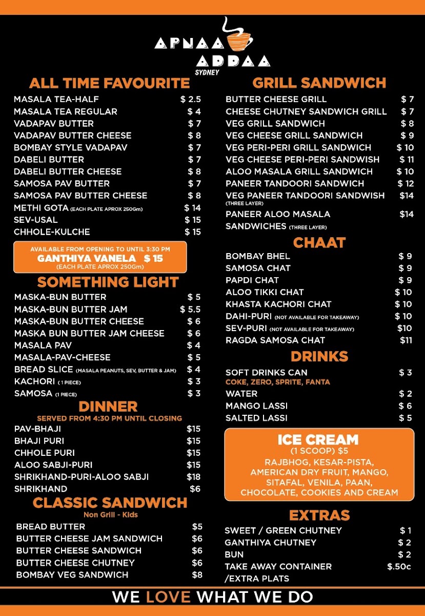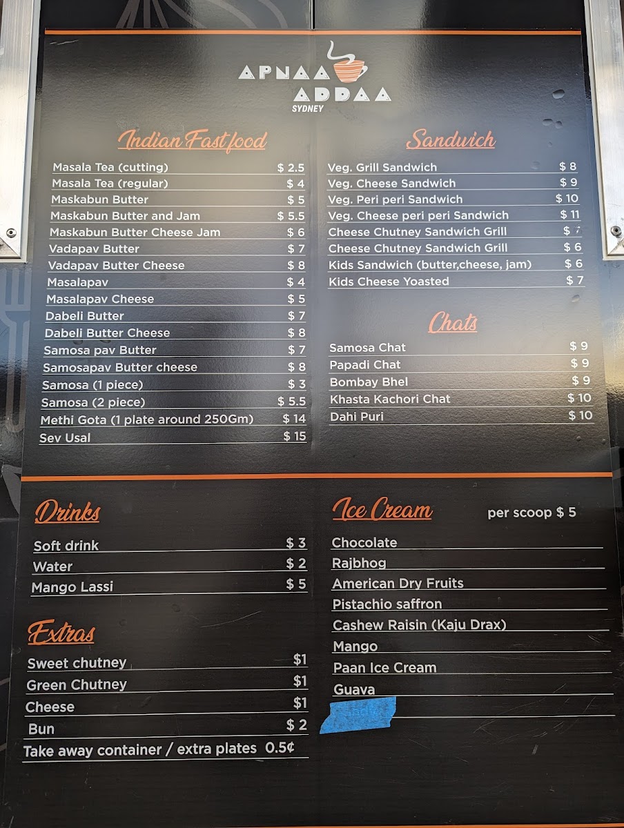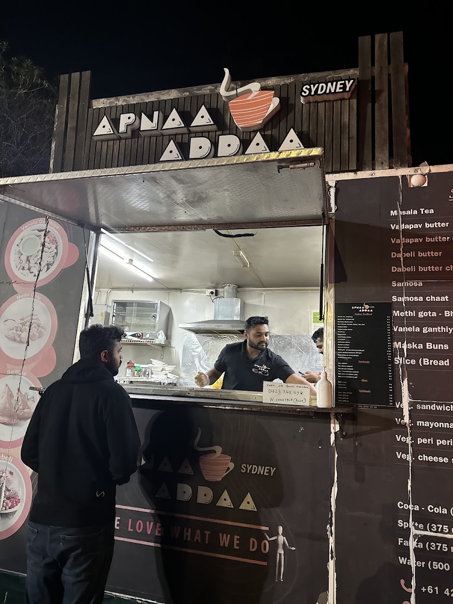Overall, the menu at Apnaa Addaa Sydney delivers a comforting mix of Indian street food classics and light bites that feel both nostalgic and satisfying. The “All Time Favourite” section highlights staples like MASALA TEA-HALF, MASALA TEA REGULAR, and indulgent options such as VADAPAV BUTTER, VADAPAV BUTTER CHEESE, and BOMBAY STYLE VADAPAV, setting the tone for a casual yet flavorful experience. The chaat selection-featuring BOMBAY BHEL, SAMOSA CHAT, PAPDI CHAT, ALOO TIKKI CHAT, and KHASTA KACHORI CHAT-offers a vibrant variety of tangy, crunchy snacks, while lighter choices like MASKA-BUN BUTTER, MASKA-BUN BUTTER JAM, and MASALA PAV provide simple yet comforting alternatives. Beverage options such as SOFT DRINKS CAN, WATER, MANGO LASSI, and SALTED LASSI complement the dishes well. For something more filling, PAV-BHAJI stands out as a hearty dinner option, while sandwich lovers can enjoy classics like BREAD BUTTER, BUTTER CHEESE JAM SANDWICH, BOMBAY VEG SANDWICH, and grilled variations including BUTTER CHEESE GRILL, VEG CHEESE GRILL SANDWICH, and VEG PERI-PERI GRILL SANDWICH. Though pricing details are not specified, the menu’s diversity and familiar street-style offerings make it an appealing spot for anyone craving authentic, casual Indian flavors.