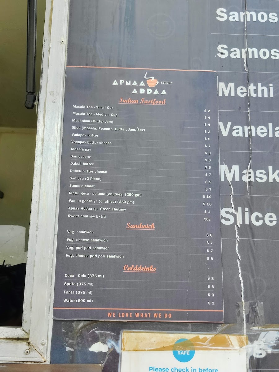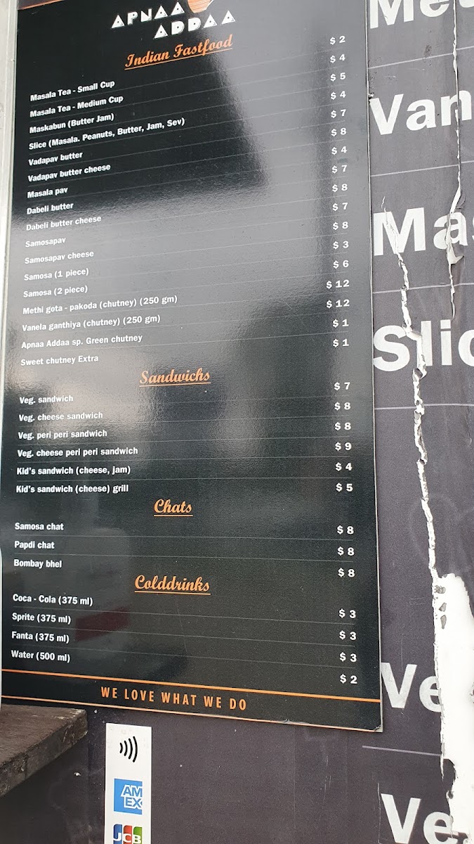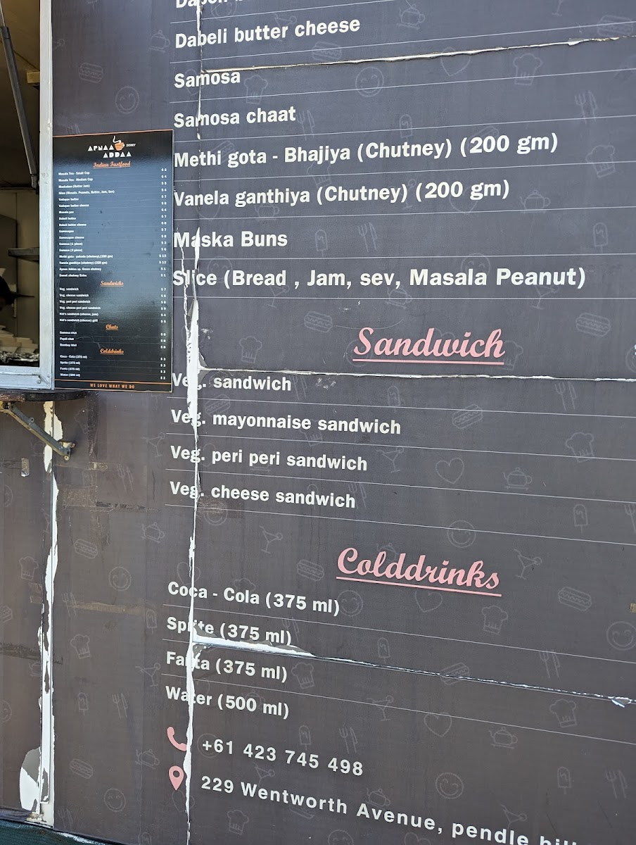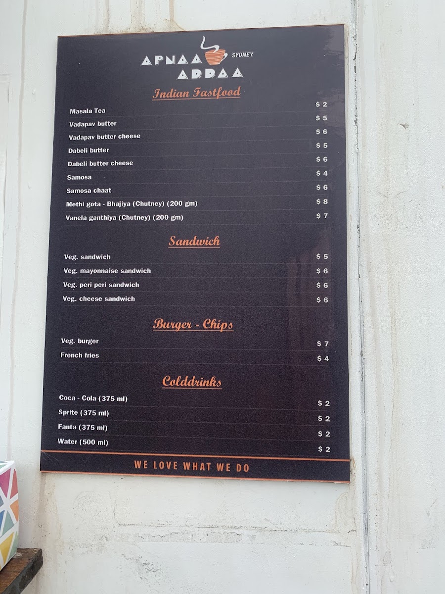Overall, the menu at Apnaa Addaa Sydney delivers a comforting mix of Indian street food classics and light bites that feel both nostalgic and satisfying. The “All Time Favourite” section highlights staples like MASALA TEA-HALF, MASALA TEA REGULAR, and indulgent options such as VADAPAV BUTTER, VADAPAV BUTTER CHEESE, and BOMBAY STYLE VADAPAV, setting the tone for a casual yet flavorful experience. The chaat selection-featuring BOMBAY BHEL, SAMOSA CHAT, PAPDI CHAT, ALOO TIKKI CHAT, and KHASTA KACHORI CHAT-offers a vibrant variety of tangy, crunchy snacks, while lighter choices like MASKA-BUN BUTTER, MASKA-BUN BUTTER JAM, and MASALA PAV provide simple yet comforting alternatives. Beverage options such as SOFT DRINKS CAN, WATER, MANGO LASSI, and SALTED LASSI complement the dishes well. For something more filling, PAV-BHAJI stands out as a hearty dinner option, while sandwich lovers can enjoy classics like BREAD BUTTER, BUTTER CHEESE JAM SANDWICH, BOMBAY VEG SANDWICH, and grilled variations including BUTTER CHEESE GRILL, VEG CHEESE GRILL SANDWICH, and VEG PERI-PERI GRILL SANDWICH. Though pricing details are not specified, the menu’s diversity and familiar street-style offerings make it an appealing spot for anyone craving authentic, casual Indian flavors.